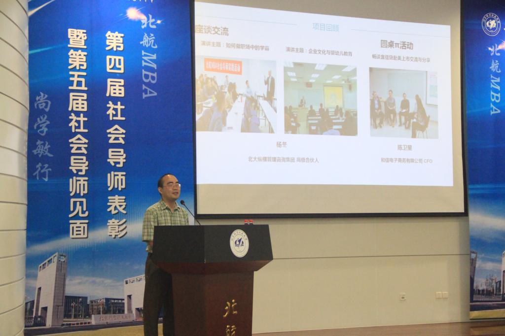 见面会上,首先由经济管理学院副院长秦中峰致开幕词,强调将创新的理念加入到办学体制中来,并且对北航MBA20周年进行了回顾,提出了对社会导师项目未来的展望。