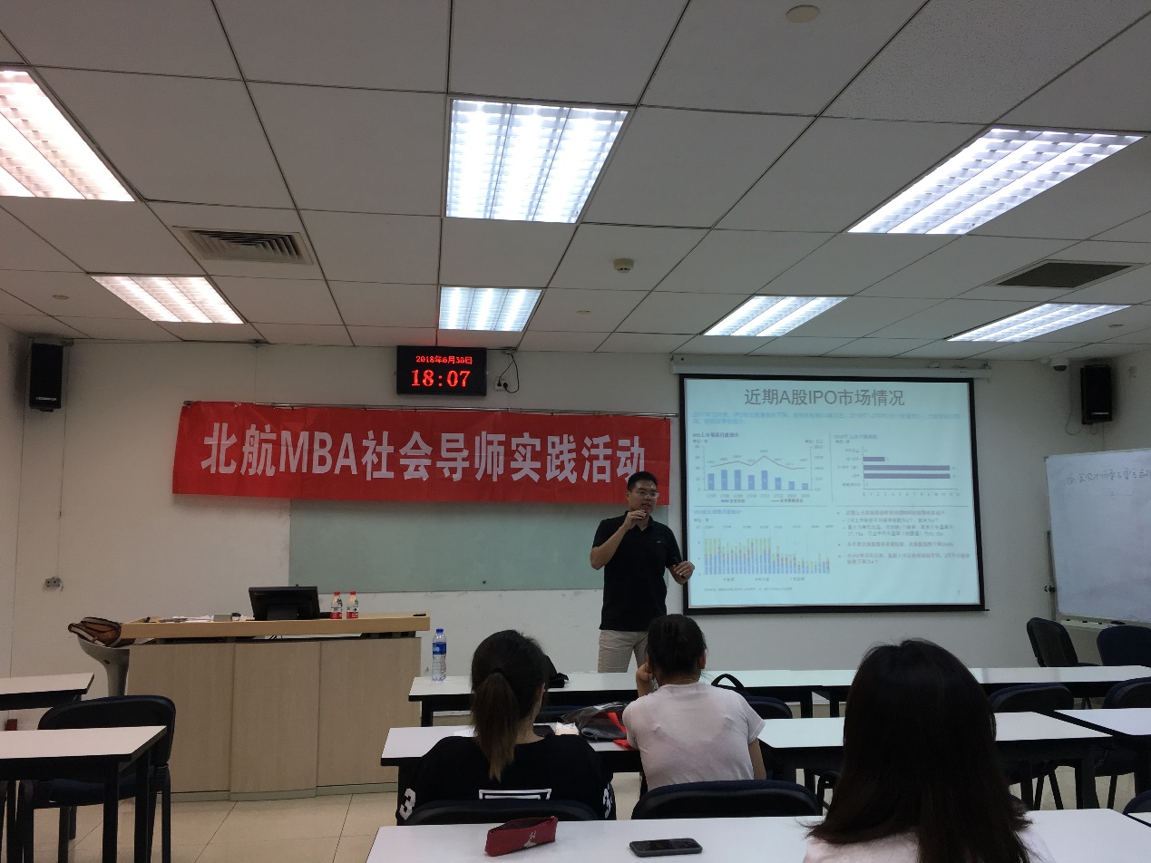 2018年6月30日晚18点,北航MBA社会导师系列活动在新主楼A949教室顺利举行。本次活动邀请的嘉宾是北航MBA社会导师冯申博士,与学生分享主题为“投资银行实务操作”的专题讲座。本次活动旨在帮助学生加深对投资银行业务的了解,并增强对证券市场的理解。