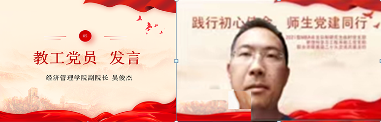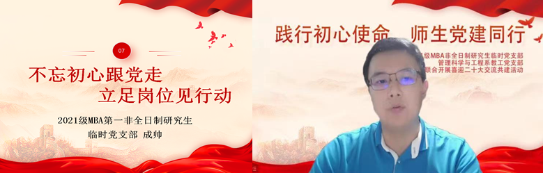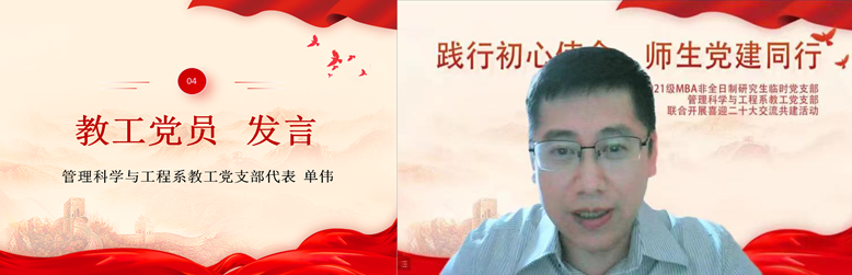 学院研究生指导主任、管理科学与工程系党员代表单伟老师在发言中提到,通过党课的学习,对党的初心使命和学院发展历程有了更深刻的认识。作为教工党员将继续做好本职工作,同时对MBA研究生临时党支部建设提出了希望。