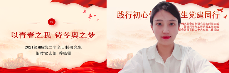 MBA学生党员乔晓雯以《以青春之我 铸冬奥之梦》为题,分享了她在2022年冬奥会担当志愿者的经历,让我们感受到她在冬奥工作中克服困难、突破自己,始终坚守的那份初心。